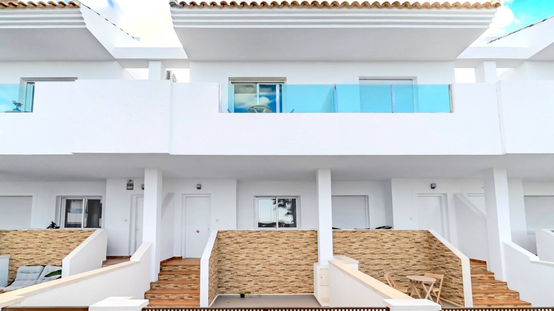 Esta casa adosada está ubicada en la zona de Los Balcones, dentro del residencial Los Altos de la Laguna en Torrevieja. La propiedad ofrece vistas al Lago Rosa y cuenta con un espacio funcional. La vivienda es un dúplex de dos plantas conectadas por una escalera interior. Tiene una superficie construida total de aproximadamente 74,69 m², con un espacio interior útil de unos 69,69 m². La distribución incluye varias habitaciones y un porche. La cocina es independiente y está completamente equipada con electrodomésticos modernos. Cuenta con tres dormitorios con armarios empotrados, uno de ellos con acceso a un balcón con vistas a la piscina comunitaria. También dispone de dos baños. En el exterior, la propiedad cuenta con un solárium privado en la azotea de aproximadamente 22,77 m², acceso a una piscina comunitaria y un jardín delantero de unos 15 m². Estos espacios ofrecen opciones para el disfrute al aire libre. Incluye una plaza de aparcamiento privada. La casa está construida con materiales como suelos porcelánicos y carpintería a medida. Está situada en una zona tranquila, cerca de supermercados, restaurantes, colegios y otros servicios. Los Balcones es una zona residencial en Torrevieja conocida por su entorno natural y las vistas al Lago Rosa. El clima es suave durante todo el año, apto tanto para residencia permanente como para vacaciones.
