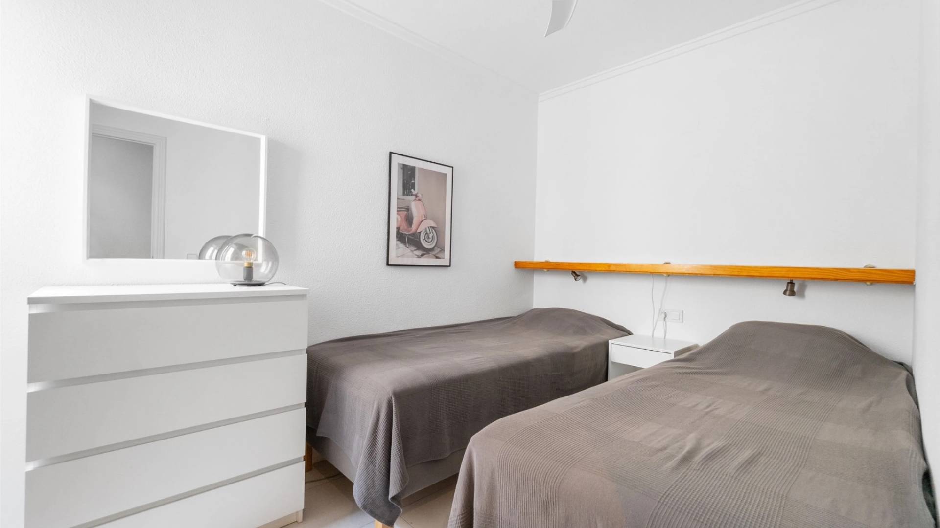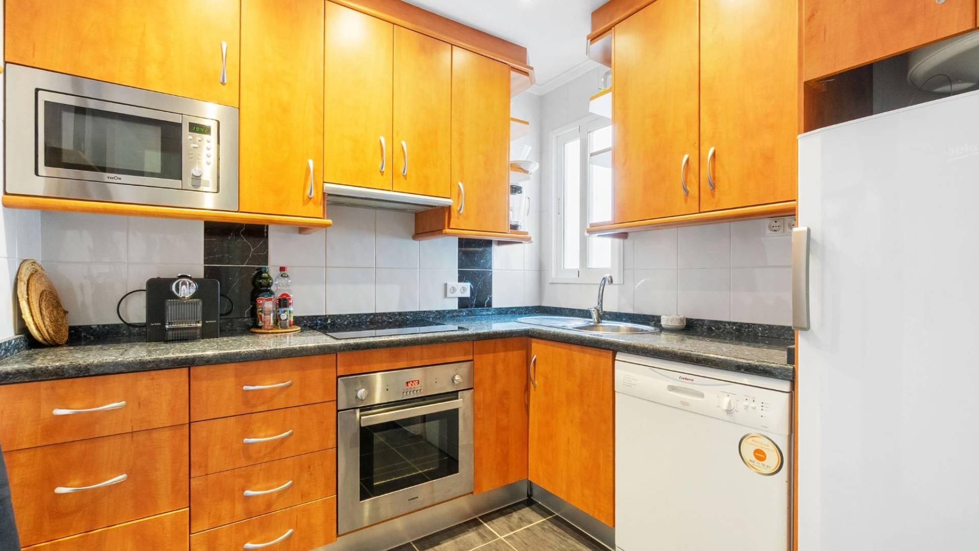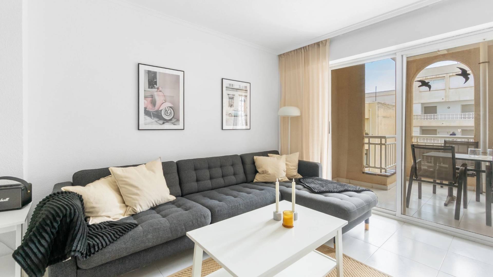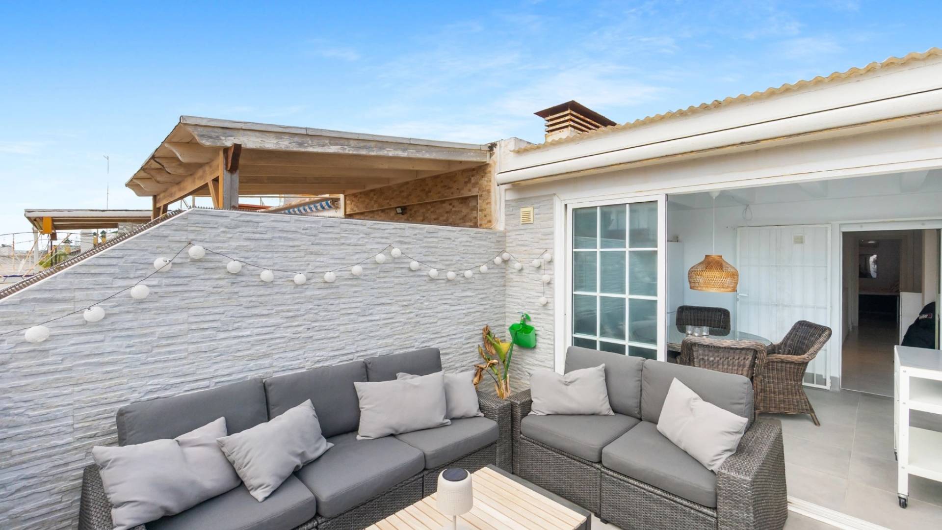 La vivienda, con una distribución inteligente, ofrece tres dormitorios y un baño reformado con ducha en la planta baja. Además, cuenta con una cocina independiente y bien equipada, y un luminoso y acogedor salón con acceso directo a una cómoda terraza cubierta desde donde se vislumbra el mar Mediterráneo a la izquierda.