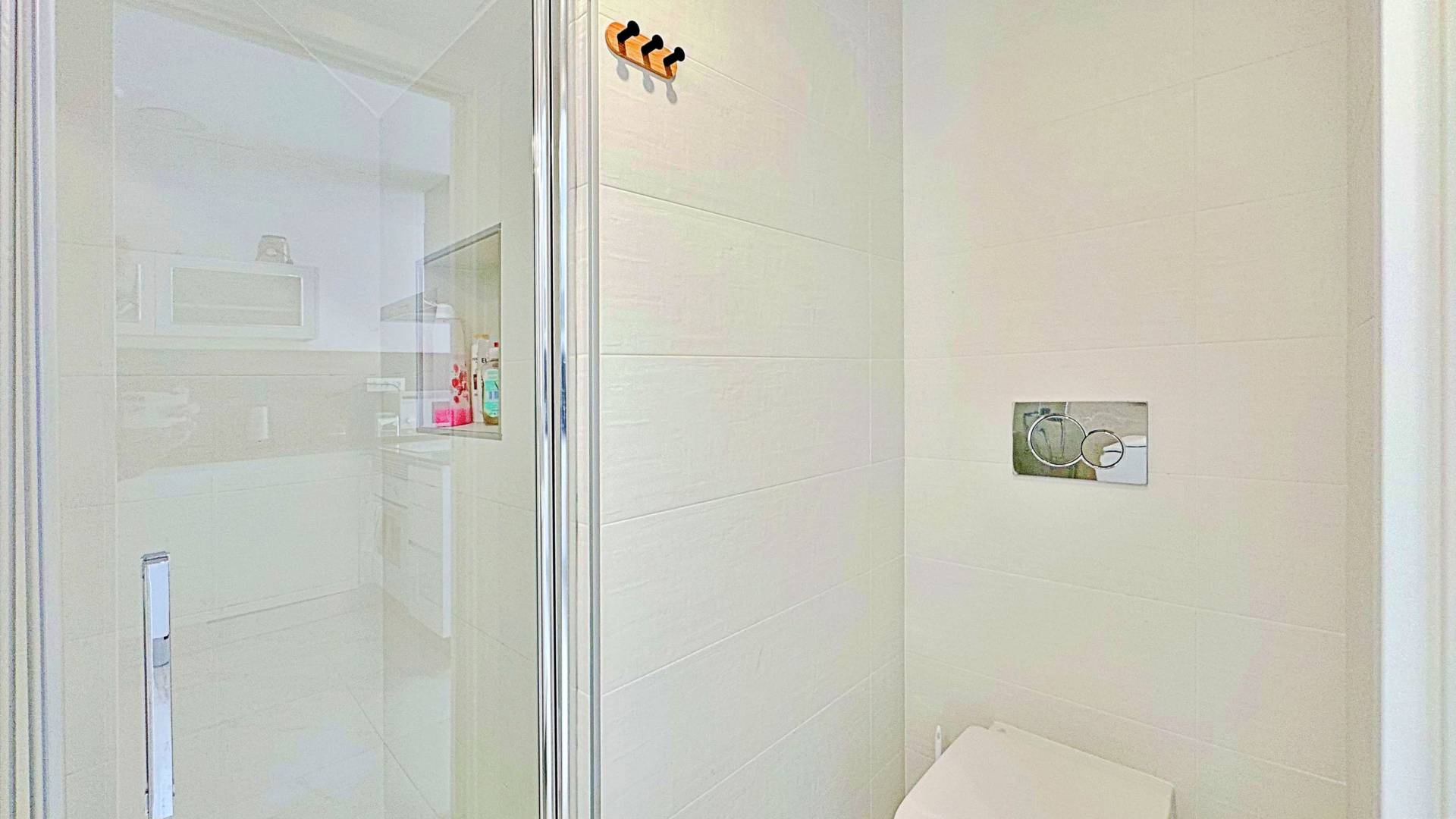 This three-bedroom, three-bathroom duplex townhouse is located in the exclusive residential area of Los Balcones in Torrevieja. The property stands out for its modern design, bright interiors and spacious terraces that allow you to enjoy the Mediterranean lifestyle all year round. On the ground floor, the house features a private 22 m² garden with space for outdoor dining. Inside, there is an open-plan living room with an elegant feature wall, connected to a fully equipped modern kitchen with appliances and breakfast bar. This level also includes a bedroom with fitted wardrobes, currently adapted as a study, and a complete bathroom with shower. Upstairs, there are two further bedrooms, both with fitted wardrobes. The master bedroom is particularly bright and has direct access to a private terrace with views of the residential area and the swimming pool. This floor also offers two additional bathrooms with modern finishes. The property also benefits from a large private solarium with open views of the Torrevieja lagoon, equipped with a chill-out area, pergola, barbecue and sun loungers — perfect for outdoor gatherings or simply relaxing in a peaceful setting. The residential complex offers large communal areas with a swimming pool surrounded by palm trees and green spaces, creating an ideal environment for families or those seeking a relaxed lifestyle. Los Balcones is one of the most established residential areas of Torrevieja, with all services nearby: supermarkets, schools, pharmacies, sports facilities and Torrevieja University Hospital. The beaches of Punta Prima and Torrevieja are less than 4 km away, making this property an excellent choice both as a permanent residence or a holiday investment.