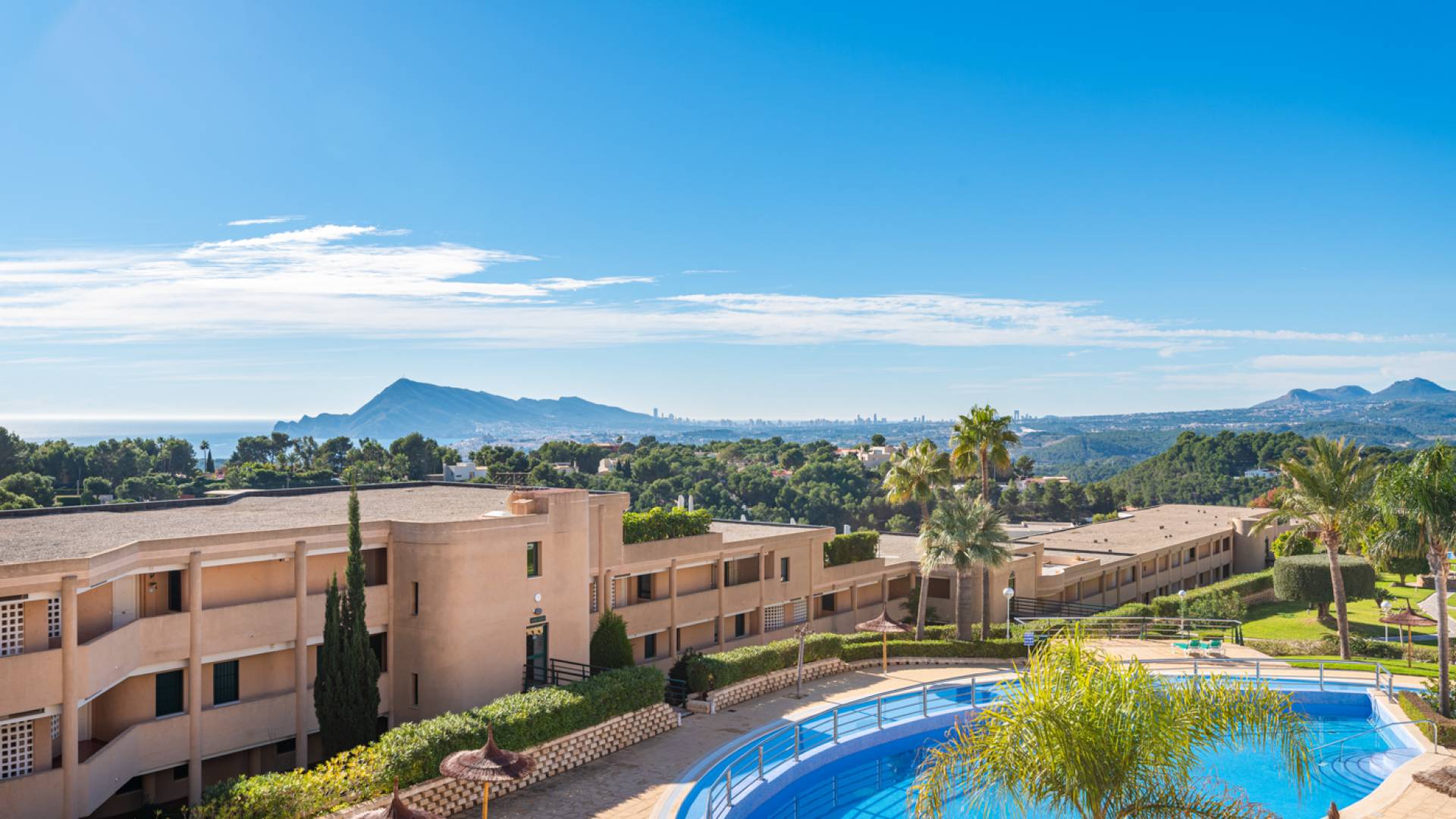This apartment in the well-known Altea la Nova urbanization is located just 1 km from the prestigious Altea Golf Club and 2 km from Altea la Vella, where it has all the services, and 2 km from the sea. The urbanization has large green areas and spectacular swimming pools. The 91m2 of the apartment are distributed in an entrance hall, 2 bedrooms, 2 bathrooms (one en suite), an independent kitchen with an attached utility room and a bright living-dining room. The master bedroom and the living room have access to the 27m2 sunny terrace with incredible views of the Sierras and the sea. Perfect place to enjoy the privileged climate of the Costa Blanca all year round. The property is equipped with air conditioning (hot/cold) and a garage space with a storage room.