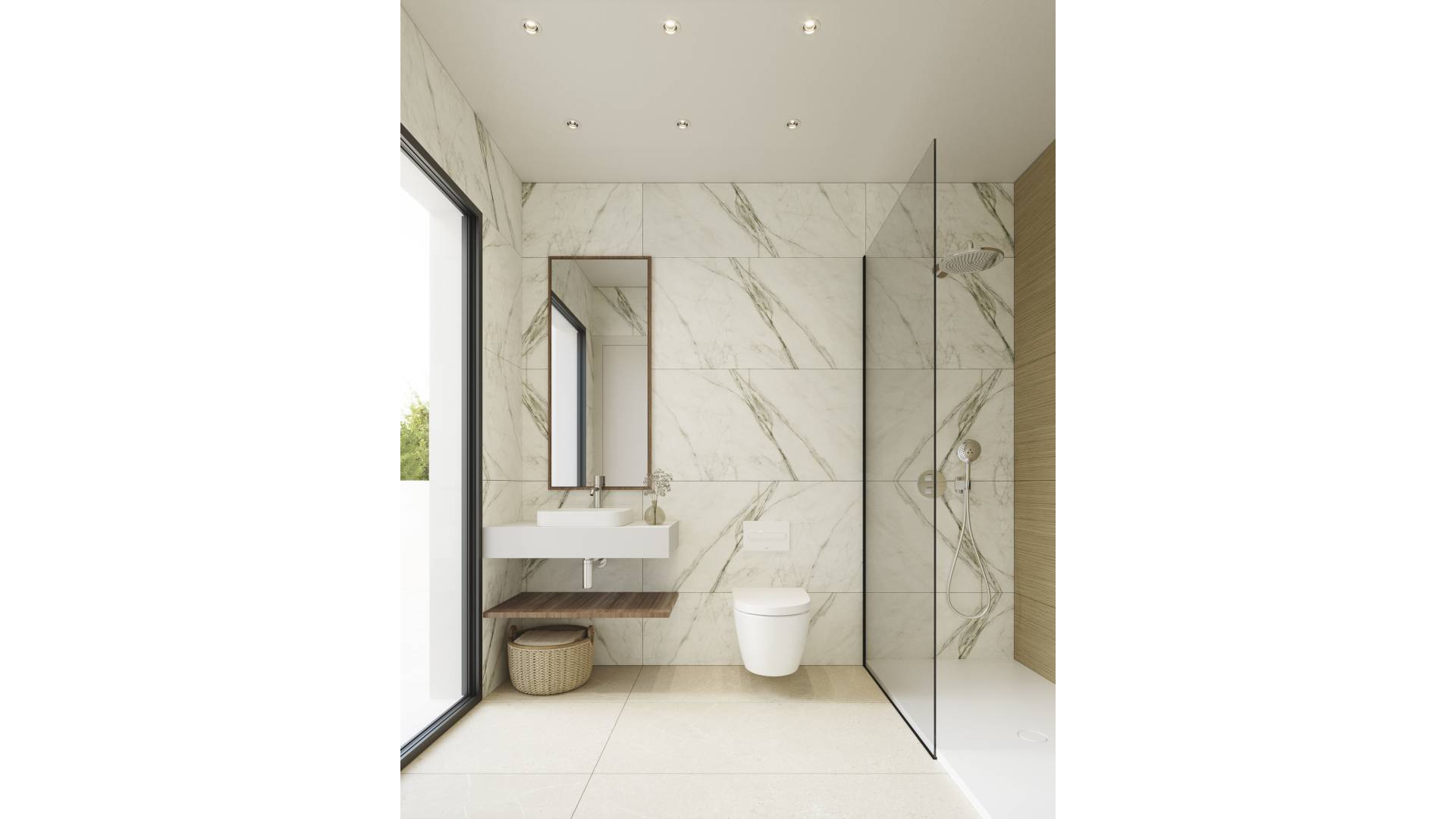 The interior of these detached homes in Polop is designed to offer maximum comfort and functionality. The porcelain tile floors add a modern and elegant touch to each room, while the built-in wardrobes in the bedrooms optimize storage space. The layout of the homes allows for a choice between three, four, or five bedrooms, and two or three bathrooms, adapting to the specific needs of each family. The option to include a solarium provides additional space for leisure and relaxation.