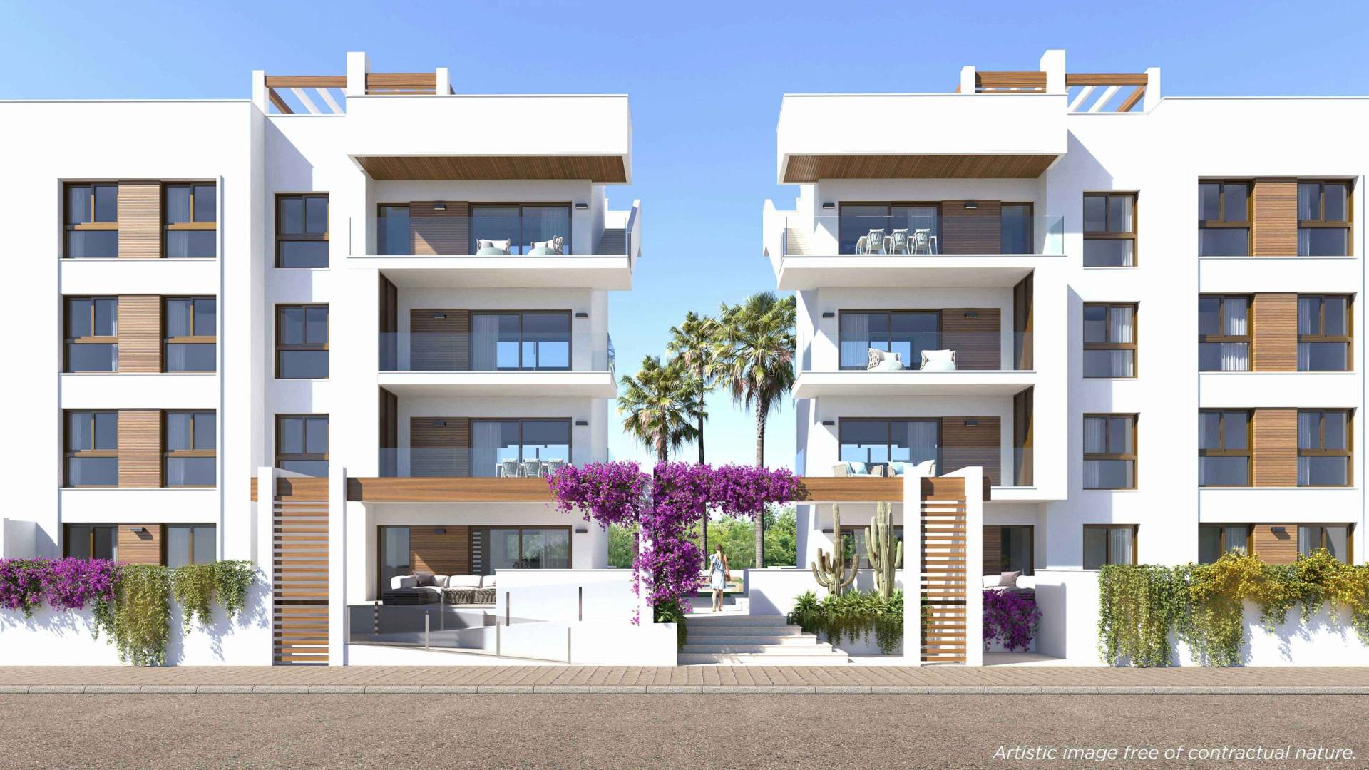The outdoor environment of these ground floor homes is designed to maximize enjoyment of the Mediterranean climate. Each property features a private garden, ideal for creating a personal outdoor space. Additionally, the terraces provide a perfect spot for relaxation or outdoor dining. The community also offers spacious landscaped areas, adding a touch of nature and tranquility to the environment, complemented by a communal pool where residents can refresh and socialize.