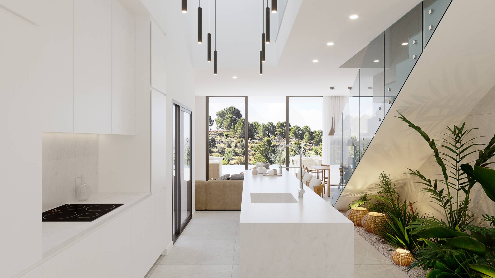 The exterior of these detached homes in Finestrat is designed to maximize enjoyment of the Mediterranean climate. Each property features a private garden, ideal for enjoying outdoor moments. The spacious terraces offer additional space to relax or entertain guests. Additionally, each home has a private pool, providing a personal oasis to cool off during warm summer days. The presence of a pergola adds a touch of elegance and functionality, allowing enjoyment of the outdoors at any time of day.