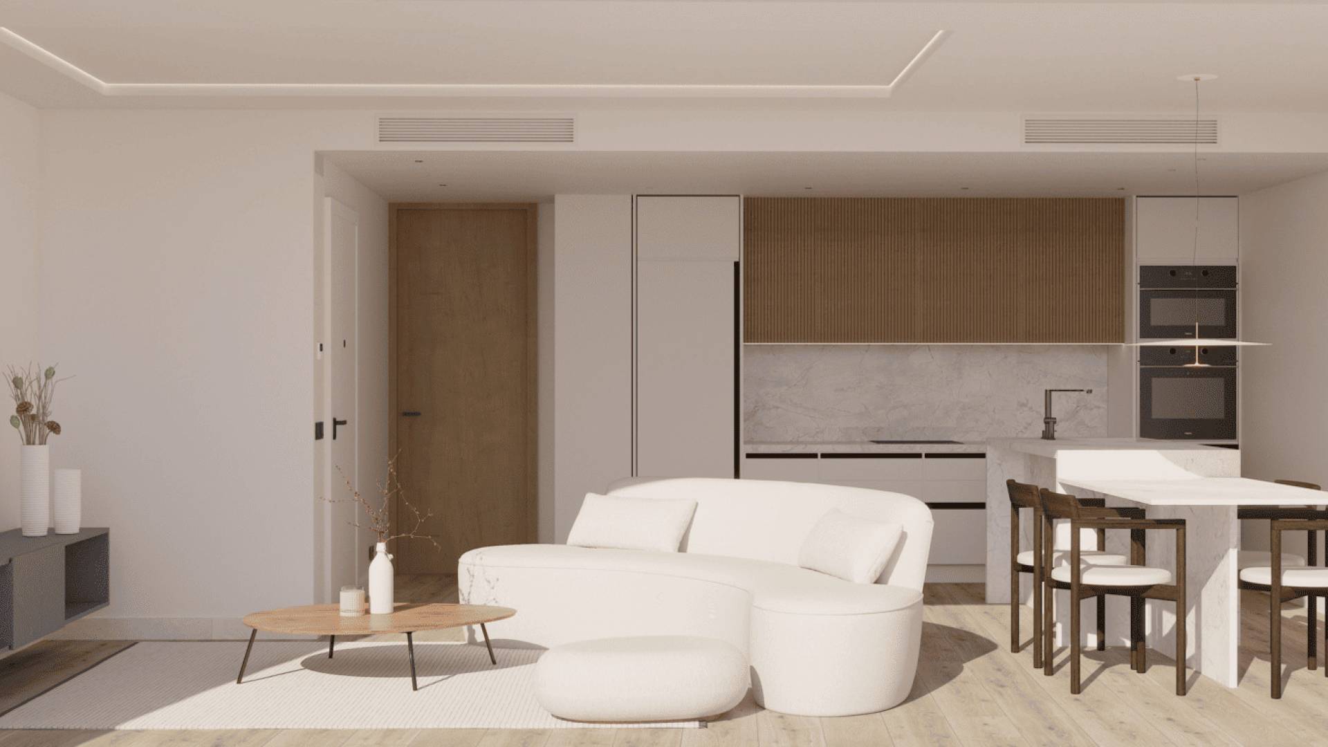 The exteriors of these bungalows are designed to make the most of the Mediterranean climate. Each property features a private garden, ideal for enjoying outdoor moments. The spacious terraces offer additional space to relax or entertain guests, while the solarium provides a perfect spot to sunbathe in complete privacy. The proximity to the sea, just 1 km away, allows for panoramic views and the enjoyment of the sea breeze, creating a serene and refreshing atmosphere.