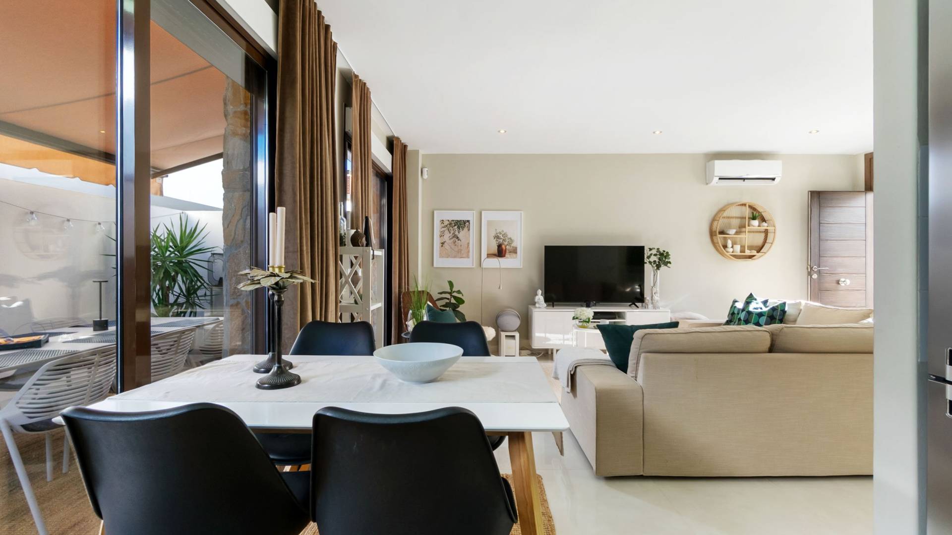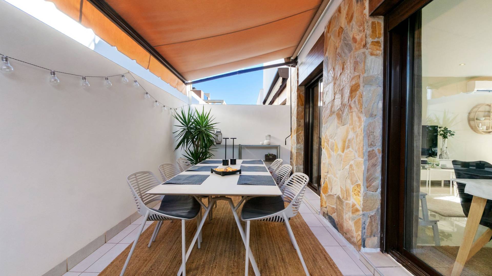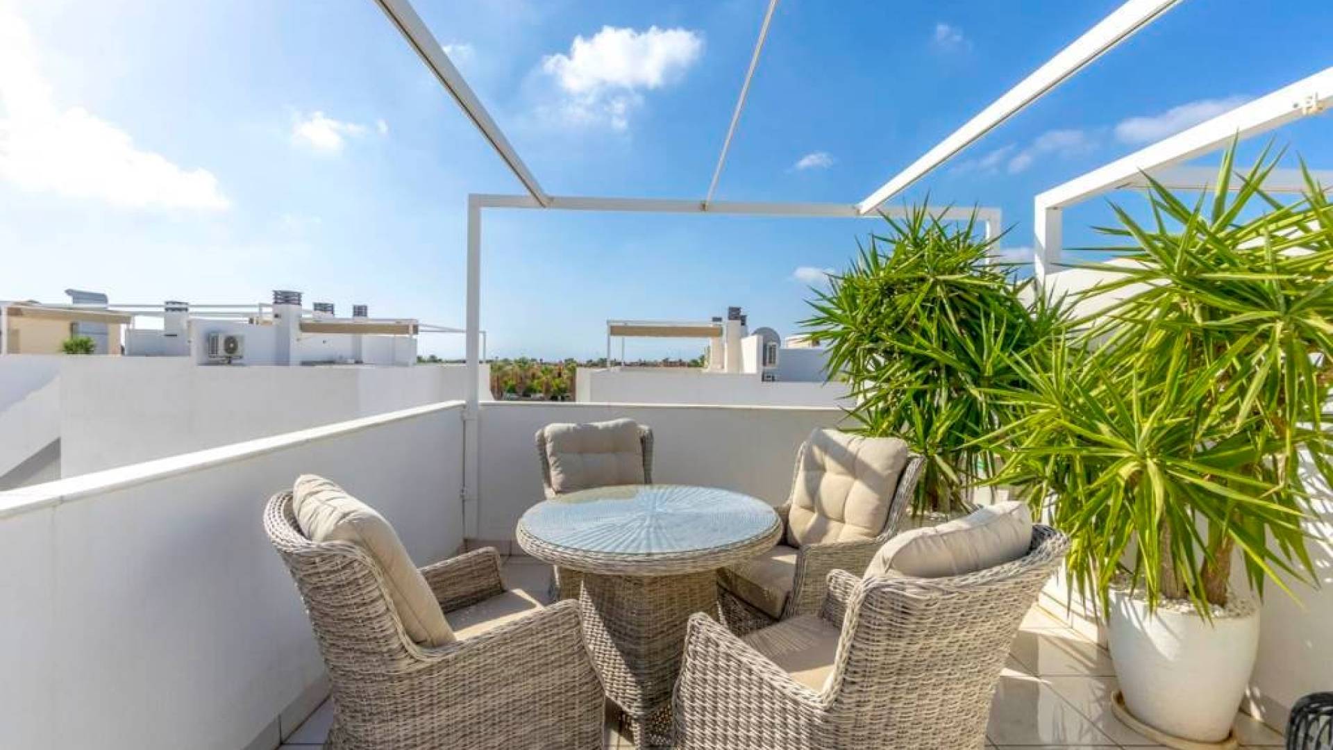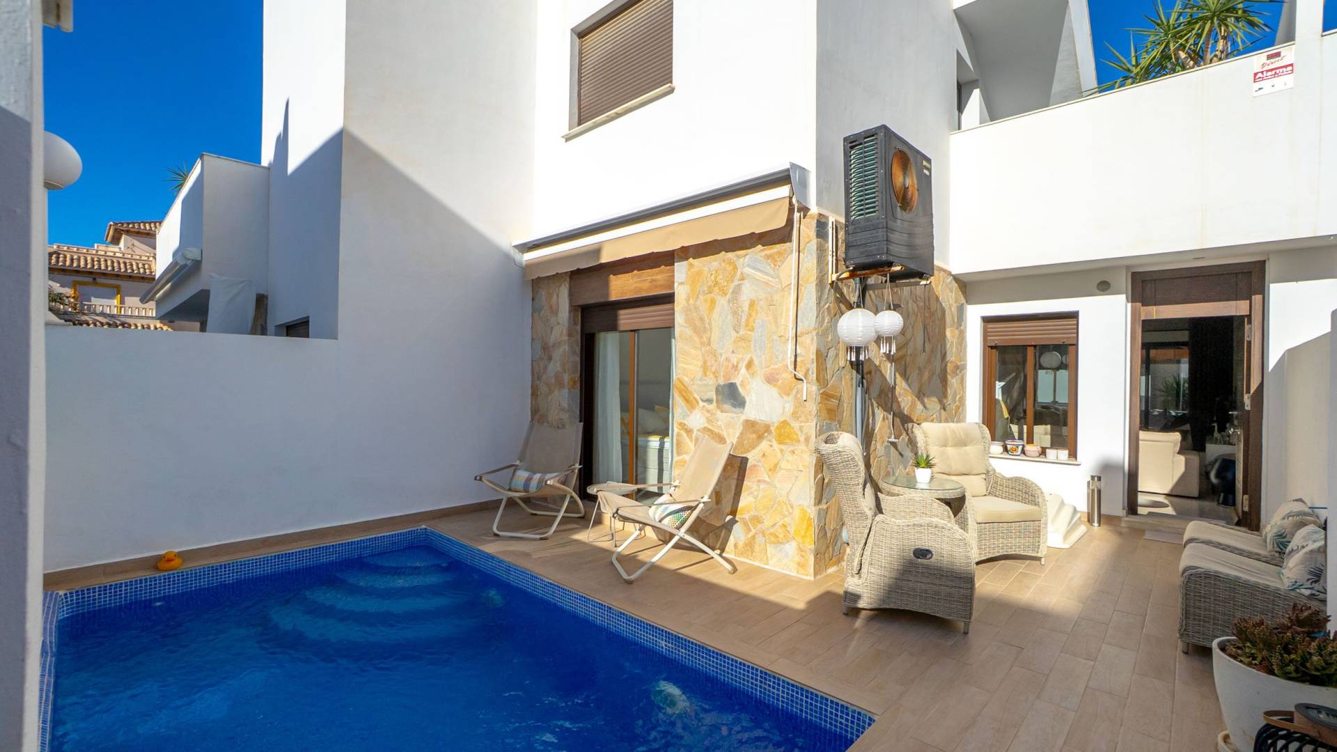 Modern and stylish townhouse with private heated pool and plenty of outside space In a pleasant urbanization in Lomas de Cabo Roig is this modern townhouse with private heated pool, roof terrace and garage space with storage room. The townhouse, is located in a pleasant and well-maintained urbanization in Lomas de Cabo Roig, close to golf courses and beautiful nature. The home offers a private pool with heating, an outdoor shower and plenty of terrace space on the ground floor both in front and behind the home with place for several seating areas. There are also awnings for that well needed shade and the opportunity to hide from the sun. Inside, you are greeted by an open plan between the kitchen and living room with plenty of natural light. There is a bedroom with a large built-in wardrobe, a bathroom with shower and underfloor heating and a practical storage room under the stairs. As previously mentioned, the kitchen is conveniently connected to the living room and the rear terrace and is equipped with high-quality appliances. On the second flir we encounter the remaining two bedrooms, also with large built-in wardrobes, and a bathroom with shower and underfloor heating. From here you reach a balcony that leads up to the private roof terrace. The roof terrace offers generous spaces, pergola with roof and sides as well as a large outdoor kitchen with washing machine and refrigerator. The home also includes a private parking space with storage in the underground garage. Just a few minutes from the home there is a very wide range of entertainment and services, as well as the Mediterranean Sea and several beautiful beaches. For more information about this property, you are welcome to contact us at Bjurfors Costa Blanca. About the Area Metropolitan Cabo Roig is considered by many to be the jewel of the southern Costa Blanca. This peninsula is characterized by smaller coves with rocky and sandy beaches alternately, luxurious villas are mixed with older and charming apartments and townhouses and along the Mediterranean coast there are scenic walks with views all the way to Torrevieja in the north and La Manga in the south. The beaches of Cala Caleta and Cala Capitan have the Blue Flag award for their environmental protection, service, safety and, not least, beauty. The area has a good mix of restaurants in different price ranges, both down by the sea and along the main road N332. There are pharmacies, bakeries, supermarkets and banks within walking distance and the area is characterised by the pleasant mix of housing with smaller homes built in the late 80s/early 90s and the large villas with inviting gardens, several of which have their own private descents directly to the beach. Best of all is the proximity to the sea no matter where in Cabo Roig you stay. The old port of Cabo Roig is well worth a visit. Sailing in all its forms is the main activity here, but other water sports are of course offered during the summer months. The old watchtower - Torre Vigia de Cabo Roig - dominates the peaceful maritime environment and if you want an Instagram-friendly picture from your holiday, you are guaranteed to find it here. Lomas de Cabo Roig is a lively area all year round with a high and beautiful location between the sea and golf as its name; the hills of Cabo Roig indicates. Here you are close to everything you need and the area has many permanent residents and a good mix of nationalities. Lomas de Cabo Roig has grown rapidly in recent years with a lot of newly produced homes and a new shopping center with restaurants, grocery stores and other services. Most of the homes have nice views of the Mediterranean Sea and La Manga del Mar Menor and there are many green areas around. Local Services Inland towards Villamartin you have a solid selection of bars and restaurants where the La Fuente shopping center is located about 2 km in which is well visited, regardless of the time of year. Towards the sea you will find the Cabo Roig strip which offers good nightlife and Campoamor stands for the slightly more luxurious eateries, with several beach clubs in the summer. Within a radius of 5 km there are 4 fine 18-hole golf courses; Villamartin, Las Ramblas, Campoamor and Las Colinas, all of which are of a good standard.