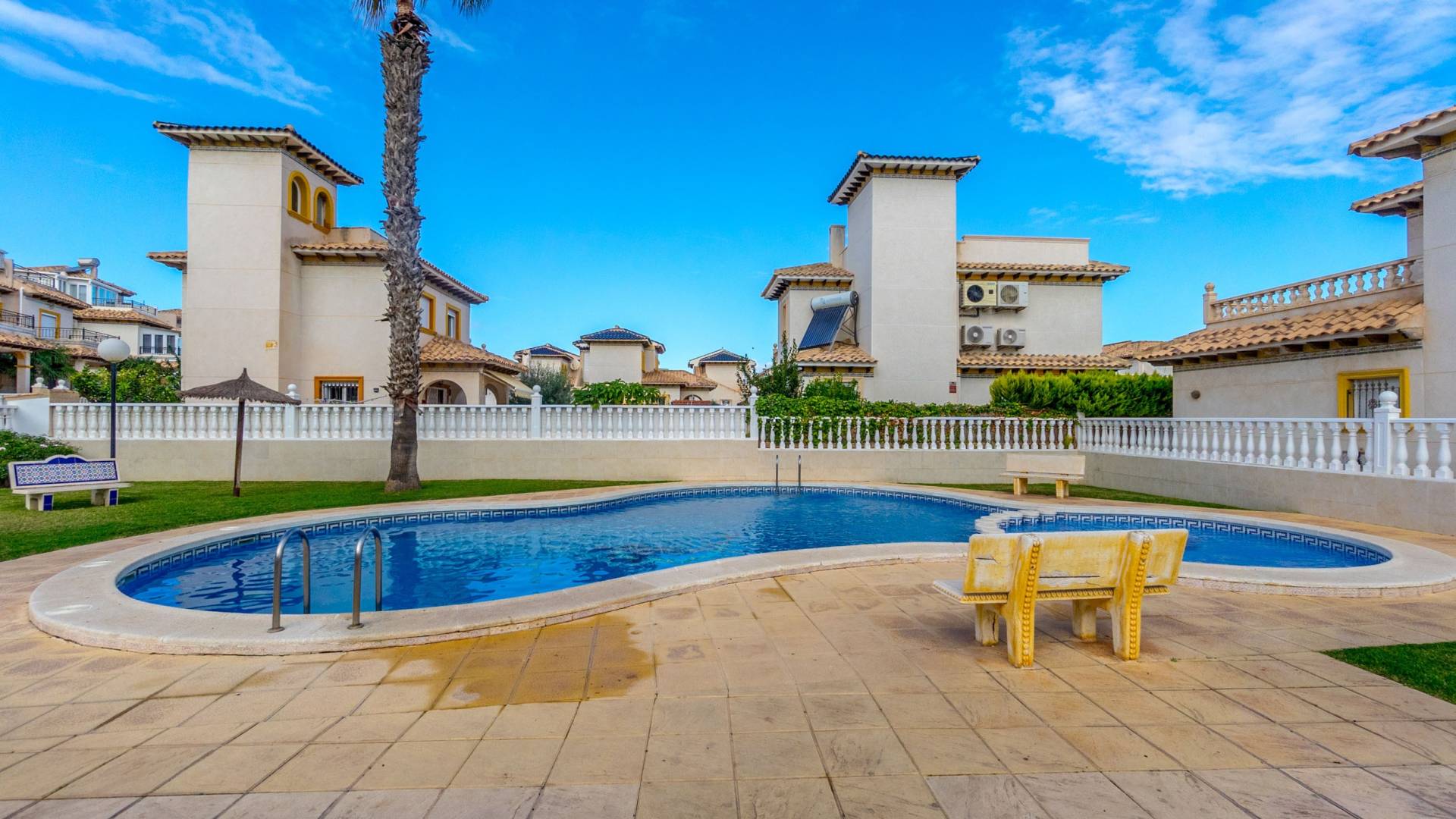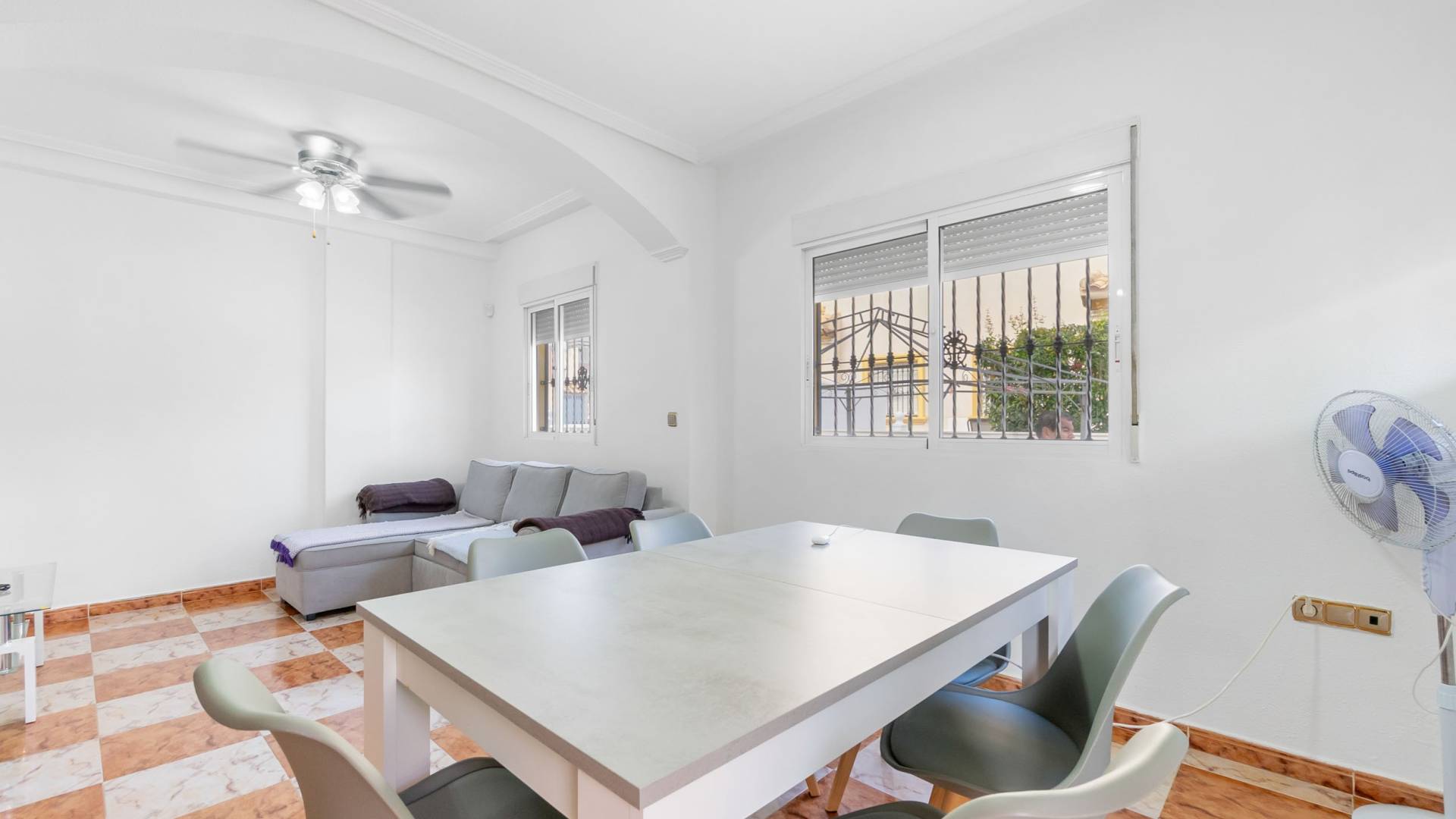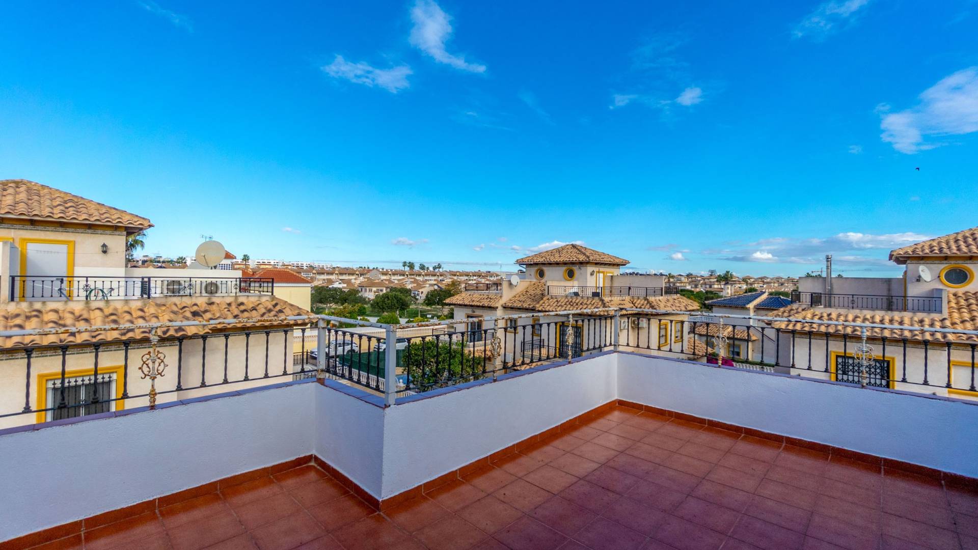 Well-maintained townhouse located in the charming and sought-after area of La Regia Charming townhouse in La Regia with two-three bedrooms, roof terrace, parking space and pleasant urbanization with communal pool. This charming quad house is located in a quiet and pleasant area of La Regia, Cabo Roig, and offers a perfect combination of comfort, generous spaces and proximity to a wide range of amenities and leisure activities. The property is distributed over two floors and has a spacious ground floor terrace with plenty of space for outdoor dining, relaxation and a large private parking area directly on the plot. As you step inside, you are greeted by an inviting open-plan living area where the kitchen, dining area and living room seamlessly flow together. Large windows let in plenty of natural light and create a warm and airy atmosphere. There is also a practical guest toilet on the entrance floor, and for those who wish to have an extra bedroom, there is the possibility of restoring the original third bedroom. Upstairs you will find two spacious bedrooms with built-in wardrobes and a large bathroom with a bathtub. The master bedroom has direct access to a lovely northeast-facing balcony with a pleasant view of the urbanization's private street - a perfect place for your morning coffee or a quiet moment outdoors. At the top, a fantastic roof terrace awaits you with plenty of space for sun loungers, patio furniture and beautiful views of the surroundings. Here you can sunbathe, socialise or simply enjoy the peaceful environment. The urbanization also offers a very nice communal pool surrounded by well-kept green areas, which creates a lovely place to cool off and enjoy the Mediterranean climate. In the immediate area there is a large selection of restaurants, shops and supermarkets, while the beautiful beaches of Cabo Roig and Dehesa de Campoamor are just a few minutes away. Within a short drive you can reach several well-known golf courses and larger shopping centers such as La Zenia Boulevard. Welcome to contact Bjurfors Costa Blanca for more information or to book a viewing! About the Area Metropolitan Cabo Roig is considered by many to be the jewel of the southern Costa Blanca. This peninsula is characterized by smaller coves with rocky and sandy beaches alternately, luxurious villas are mixed with older and charming apartments and townhouses and along the Mediterranean coast there are scenic walks with views all the way to Torrevieja in the north and La Manga in the south. The beaches of Cala Caleta and Cala Capitan have the Blue Flag award for their environmental protection, service, safety and, not least, beauty. The area has a good mix of restaurants in different price ranges, both down by the sea and along the main road N332. There are pharmacies, bakeries, supermarkets and banks within walking distance and the area is characterised by the pleasant mix of housing with smaller homes built in the late 80s/early 90s and the large villas with inviting gardens, several of which have their own private descents directly to the beach. Best of all is the proximity to the sea no matter where in Cabo Roig you stay. The old port of Cabo Roig is well worth a visit. Sailing in all its forms is the main activity here, but other water sports are of course offered during the summer months. The old watchtower - Torre Vigia de Cabo Roig - dominates the peaceful maritime environment and if you want an Instagram-friendly picture from your holiday, you are guaranteed to find it here. Lomas de Cabo Roig is a lively area all year round with a high and beautiful location between the sea and golf as its name; the hills of Cabo Roig indicates. Here you are close to everything you need and the area has many permanent residents and a good mix of nationalities. Lomas de Cabo Roig has grown rapidly in recent years with a lot of newly produced homes and a new shopping center with restaurants, grocery stores and other services. Most of the homes have nice views of the Mediterranean Sea and La Manga del Mar Menor and there are many green areas around. Local Services Inland towards Villamartin you have a solid selection of bars and restaurants where the La Fuente shopping center is located about 2 km in which is well visited, regardless of the time of year. Towards the sea you will find the Cabo Roig strip which offers good nightlife and Campoamor stands for the slightly more luxurious eateries, with several beach clubs in the summer. Within a radius of 5 km there are 4 fine 18-hole golf courses; Villamartin, Las Ramblas, Campoamor and Las Colinas, all of which are of a good standard.