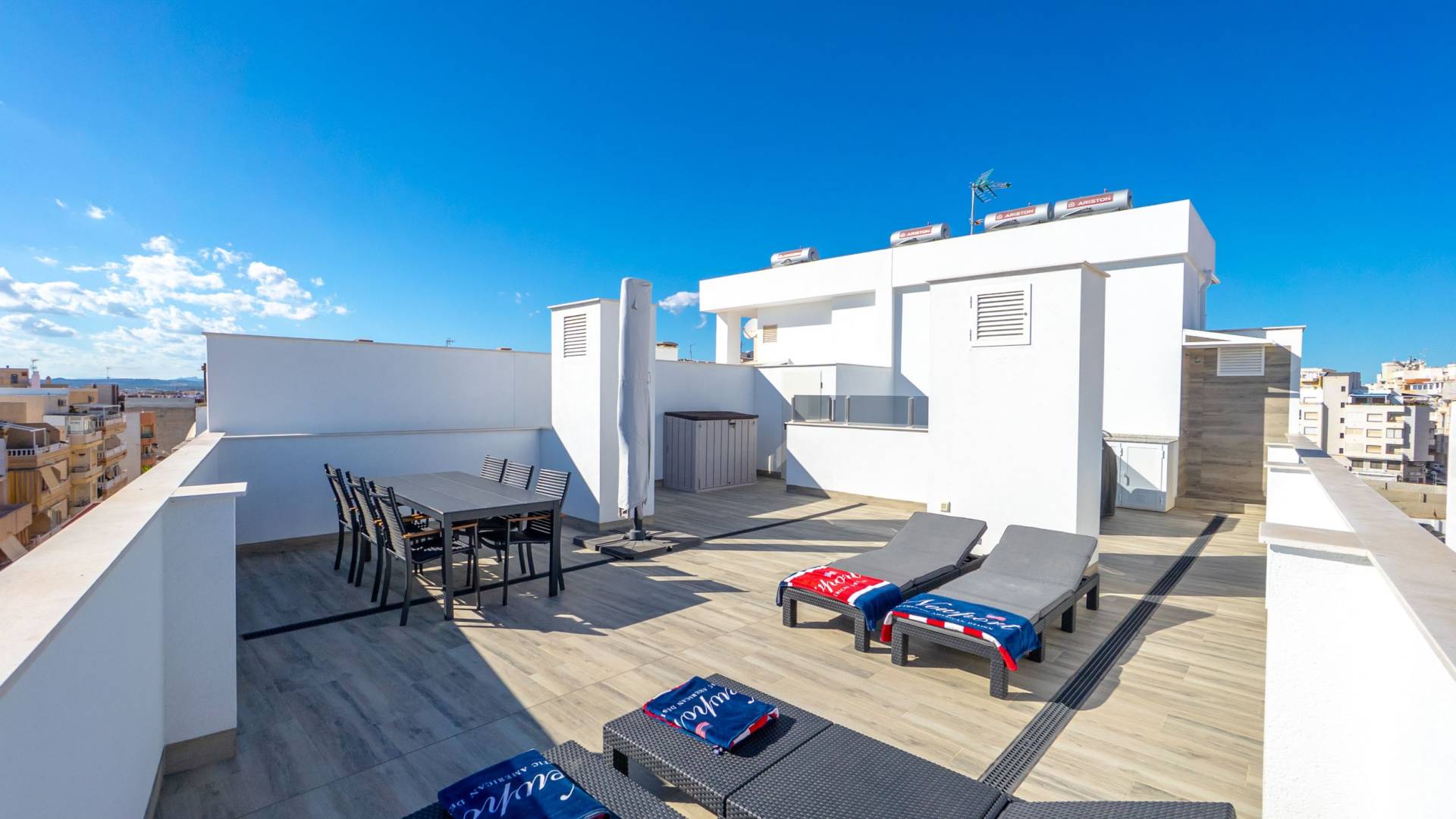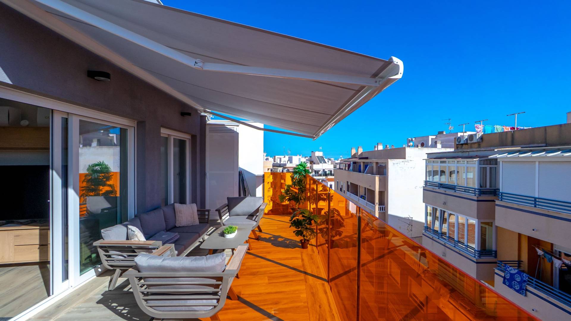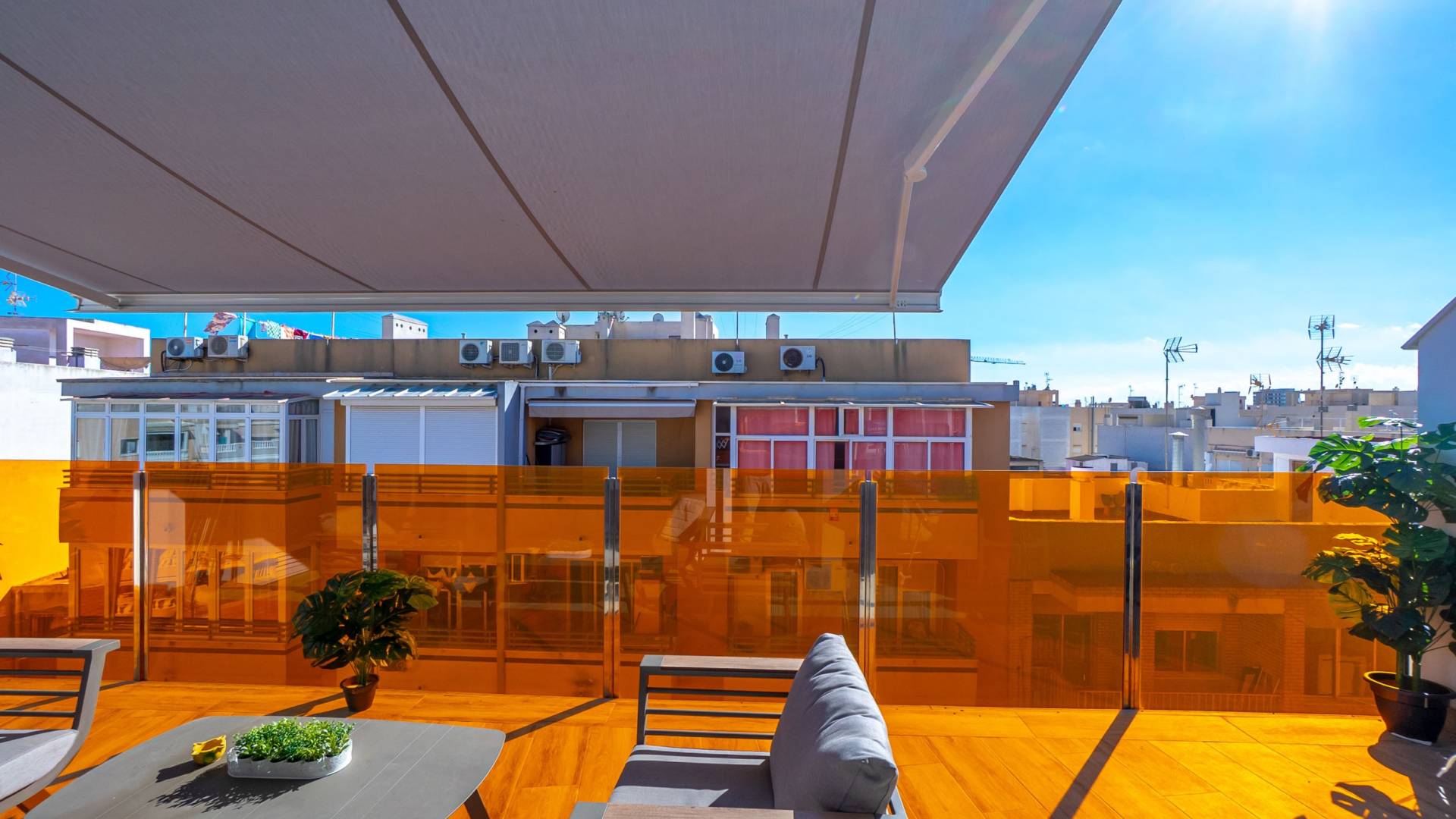 Stylish penthouse 350 m from Playa del Cura, Torrevieja Fresh home in new condition with two bedrooms, two bathrooms, balcony and private roof terrace with sea views. Welcome to this fantastic home in Edificio Alegria XVII, a modern and sought-after residence in central Torrevieja where the city pulse meets the Spanish sun. The location is absolutely excellent. Here you live in the heart of Torrevieja with everything you could want within a few minutes' walk - restaurants, cafes, shops, grocery stores, pharmacies and the bus station. Just a few blocks away is the popular Playa del Cura, one of the city's most beloved beaches, where you can start the day with a swim in the sea or a walk along the promenade. The apartment is located on the fifth floor of a building built in 2023, with an elevator and all the amenities that come with a newly built house. The apartment is in new condition with thoughtful material choices, stylish design and a pleasant atmosphere that makes it easy to feel at home. When you step inside, you are greeted by a bright and open floor plan where the living room and kitchen flow together in a harmonious way. The modern kitchen is fully equipped and integrated in an elegant way that invites both cooking and socializing. Light flows in through large windows, and the eye is immediately drawn to the spacious balcony with its characteristic orange railing - a splash of color that has become a hallmark of the house. The balcony has a perfect southerly orientation and offers sun from morning to evening. There is plenty of space here for a dining group, plants and relaxation, and thanks to the awning you can easily create coolness during the hottest hours. From one of the two bright and relaxing bedrooms you can reach directly out to the balcony - a lovely detail that extends the room and gives an extra feeling of space. There are also two modern and stylish bathrooms with a shower, one of which is en suite and creates a feeling of extra comfort and privacy. Via a staircase from the balcony you take you up to the home's impressive private roof terrace of 68 m2. Here you will find your own paradise in the sun - completely private despite its central location. The terrace is equipped with an outdoor shower and outdoor kitchen, perfect for long summer days and social evenings with family and friends. The view over the city's rooftops and the sparkling Mediterranean Sea makes the experience complete. There is space for lounge furniture, sun loungers, a barbecue and a dining table - everything you need to create your own oasis in the heart of Torrevieja. The inviting pool area on the ground floor offers sunny social areas with space for relaxation and socializing, complemented by a modern sauna for extra everyday luxury. In addition to the private terrace, the property also has a shared roof terrace with barbecue facilities for the residents - a social place where you can enjoy lovely evenings under the Spanish sky. This is a residence that combines the best of two worlds - the conveniences of the city and the relaxing Mediterranean feel - and is perfect for both permanent residence and holiday home. Living in Torrevieja Center The most famous resort town south of Alicante is Torrevieja, which has been transformed from an old fishing village into a modern medium-sized town in the last few decades. With more than 100,000 inhabitants, Torrevieja has doubled its population over the past 30 years. In addition to fine sandy beaches, bays and beautiful beach walks, there is a large selection of shops, restaurants and bars as well as a rich nightlife. Torreviejas' center is contemporary and modern. It is located in front of the beach and the marina of the city. The Plaza de la Constitucion is the main axis of the center, where the town hall and the church of the Immaculate Conception are located, built with the stone of the Old Tower, from which the name of the city comes. Near the square is the Torrevieja Casino, built in 1896 and in a modernist style, where the facade with a neon-Nazari canopy stands out. It is one of the most popular terraces for Torrevejenses and tourists. Around the square are the most commercial streets of the city and the museums. You can visit the food market, known as "La Plasa", a good place to buy fresh products from the sea and the orchard of Bajo Segura; and the Museum of the Sea and Salt, the most important in the city because it reflects its origins and the importance of salt in its history. Torrevieja is located 36 km south of Alicante Airport and people from all over the world have been attracted here for various reasons, primarily the healthy climate with 320 days of sunshine a year, but also the opportunities offered by a multicultural tourist paradise. Here is everything you could need to live and live all year round and although there are many foreign residents here, it is still a bustling Spanish city with narrow streets and several small squares. In the northern part of Torrevieja, lies Torre La Mata which boasts its long promenade lined with restaurants and nightclubs. Here you live with direct proximity to the city, but do not have to be in the heaviest pulse. Here we can offer all types of housing in all possible price ranges. The northern part of Torrevieja really has something for everyone! South of the city after Mar Azul lies the bay of Cala Ferris; which offers a nice contrast to everything around. Framed by palm trees with small golden dunes, this is a place to enjoy a quiet swim in the crystal clear waters or something to drink at Restaurante Ferris with the terrace right next to the sea's rippling waves. Do you have any questions regarding selling or buying property in Torrevieja? Do not hesitate to contact our real estate agents in Torrevieja, and they will be delighted to assist you.