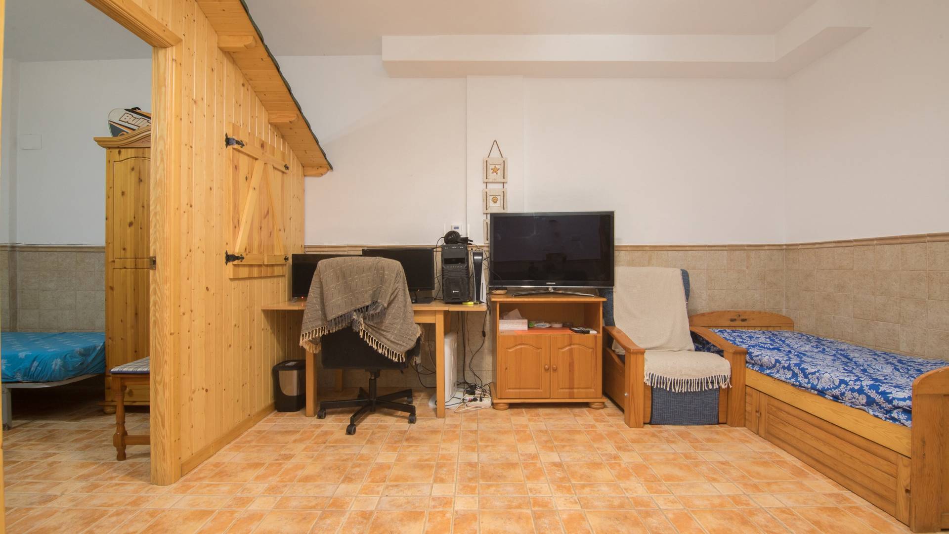 Cozy bungalow just 100 meters from the beach in Santa Pola del Este. Spectacular four-story bungalow located in one of the most attractive areas of Santa Pola, just 100 meters from the beach. This property stands out for its spaciousness, natural light, and excellent south-facing orientation, ensuring sunlight throughout the day. It features a private entrance directly from the street and a built area of 111 square meters, distributed across a basement, ground floor, first floor, and attic, all connected by an internal staircase. The ground floor includes a generous living-dining room, an independent kitchen, a guest toilet, and a large south-facing porch—perfect for enjoying the sun and sea breeze. The basement has been fully utilized by the current owners and transformed into a large activity room, divided into a cozy sitting area and two additional bedrooms. The first floor features two bedrooms, a full bathroom, and a balcony-style terrace with open views. The attic offers a spacious third bedroom with direct access to a private solarium terrace, ideal for relaxing or sunbathing in complete privacy. The property is equipped with air conditioning on both the main floor and in the attic, ensuring comfort throughout the year. It also includes a large parking space. Located in a charming and family-friendly residential complex with a large communal pool, this home is ideal for families or anyone looking for a second residence by the sea. Its location is undoubtedly one of its greatest advantages: just a few steps from the Pola Max shopping center—with a supermarket, cinema, and a variety of services—and within walking distance of Santa Pola's town center. In addition, it is only a 15-minute drive from Alicante International Airport. Santa Pola is a delightful coastal town known for its fine sandy beaches, Mediterranean climate, and relaxed lifestyle. With its fishing port, seafood-based cuisine, local markets, and scenic seafront promenade, it offers the perfect environment for living or enjoying unforgettable holidays. A versatile, well-located property with everything you need to move in and start enjoying immediately.