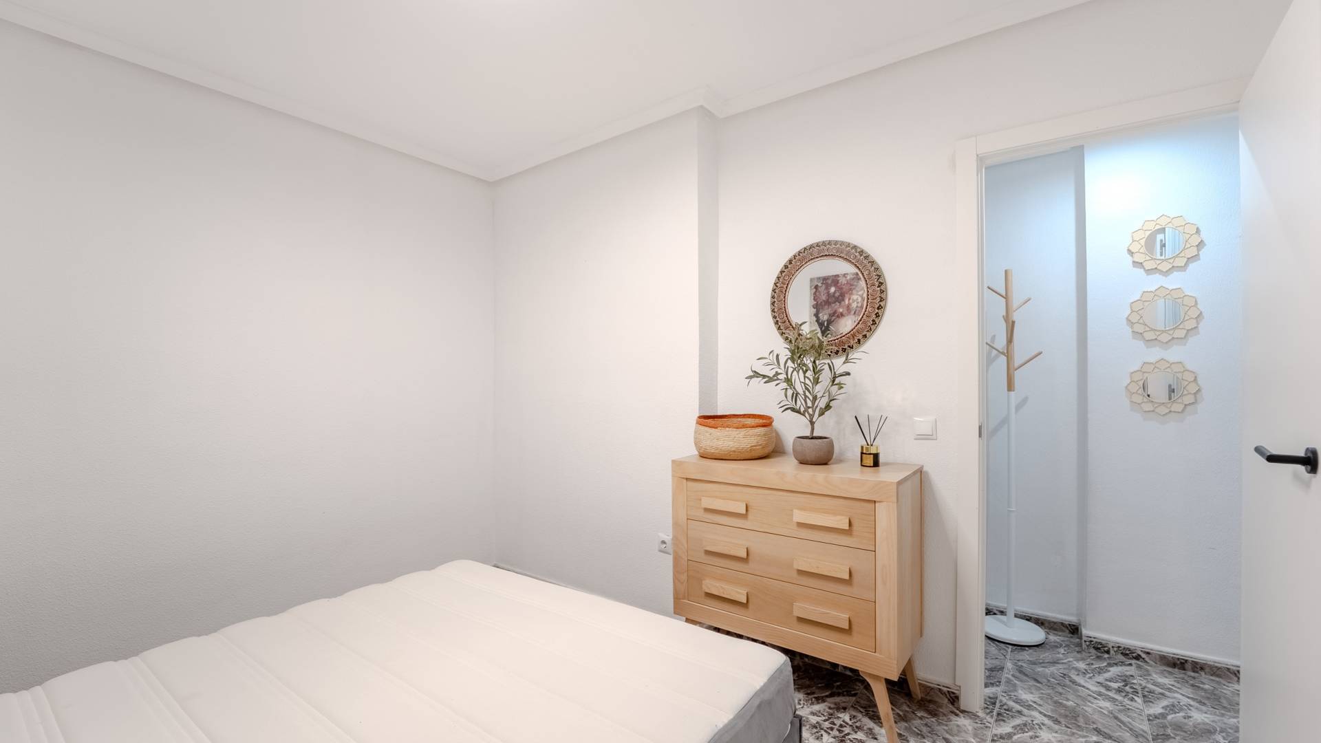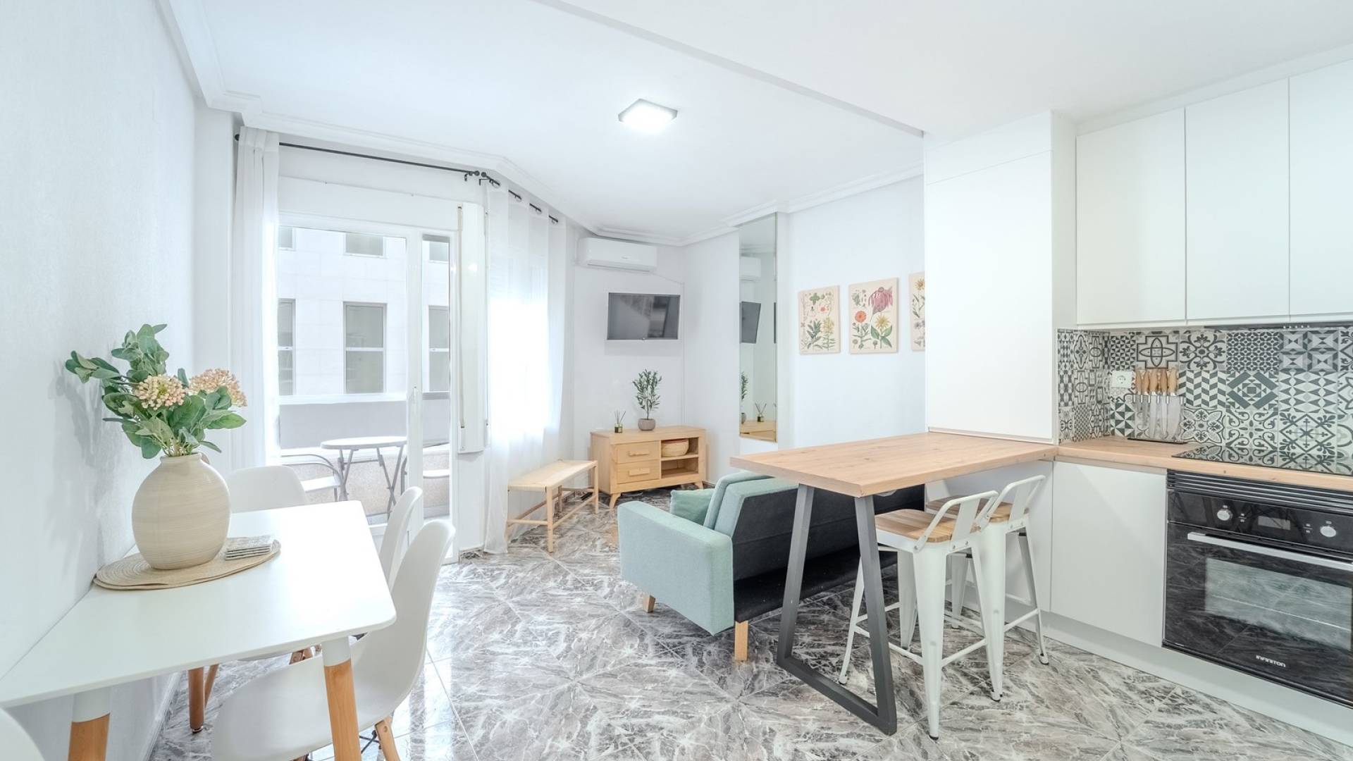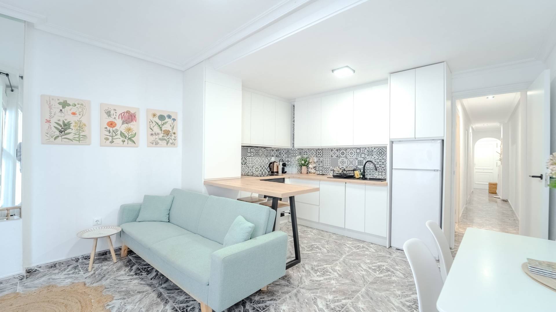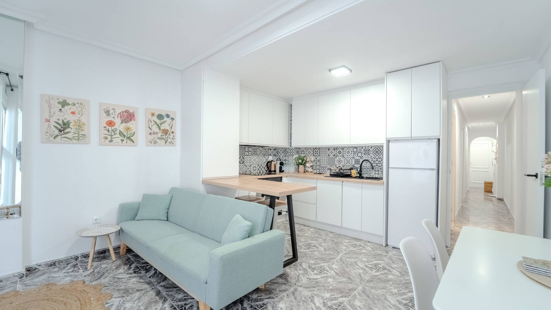 Renovated apartment with sea glimpse Renovated apartment with two bedrooms, open social areas and a cozy balcony with a side view of the Mediterranean Sea, near the beach in central Torrevieja. A warm welcome to this tastefully renovated apartment in one of Torrevieja's most sought-after locations - just a stone's throw from the sea and approximately 200 meters from the popular beach Playa del Cura. The home offers an open floorplan with livingroom and kitchen that interact in a harmonious and inviting way. The stylish kitchen is fully equipped with modern appliances and generous work surfaces, creating an ideal environment for both everyday life and social occasions. The living room is bright and pleasant, equipped with AC for high comfort during all seasons of the year. The apartment has two peaceful bedrooms and a fresh bathroom with a shower in a modern design. From the living room you can reach a small balcony where you can enjoy a pleasant side view of the sea - a perfect place for your morning coffee or a relaxing moment in the evening sun. Here you live in the heart of the city with immediate proximity to restaurants, cafes, shops and every conceivable service. An optimal accommodation for both permanent use and vacation. The home also includes a practical storage room located on the shared roof terrace - a much-appreciated extra that simplifies everyday life. This is a home that elegantly combines style, comfort and an unbeatable location on the Mediterranean Sea. Living in Torrevieja Center The most famous resort town south of Alicante is Torrevieja, which has been transformed from an old fishing village into a modern medium-sized town in the last few decades. With more than 100,000 inhabitants, Torrevieja has doubled its population over the past 30 years. In addition to fine sandy beaches, bays and beautiful beach walks, there is a large selection of shops, restaurants and bars as well as a rich nightlife. Torreviejas' center is contemporary and modern. It is located in front of the beach and the marina of the city. The Plaza de la Constitucion is the main axis of the center, where the town hall and the church of the Immaculate Conception are located, built with the stone of the Old Tower, from which the name of the city comes. Near the square is the Torrevieja Casino, built in 1896 and in a modernist style, where the facade with a neon-Nazari canopy stands out. It is one of the most popular terraces for Torrevejenses and tourists. Around the square are the most commercial streets of the city and the museums. You can visit the food market, known as "La Plasa", a good place to buy fresh products from the sea and the orchard of Bajo Segura; and the Museum of the Sea and Salt, the most important in the city because it reflects its origins and the importance of salt in its history. Torrevieja is located 36 km south of Alicante Airport and people from all over the world have been attracted here for various reasons, primarily the healthy climate with 320 days of sunshine a year, but also the opportunities offered by a multicultural tourist paradise. Here is everything you could need to live and live all year round and although there are many foreign residents here, it is still a bustling Spanish city with narrow streets and several small squares. In the northern part of Torrevieja, lies Torre La Mata which boasts its long promenade lined with restaurants and nightclubs. Here you live with direct proximity to the city, but do not have to be in the heaviest pulse. Here we can offer all types of housing in all possible price ranges. The northern part of Torrevieja really has something for everyone! South of the city after Mar Azul lies the bay of Cala Ferris; which offers a nice contrast to everything around. Framed by palm trees with small golden dunes, this is a place to enjoy a quiet swim in the crystal clear waters or something to drink at Restaurante Ferris with the terrace right next to the sea's rippling waves. Do you have any questions regarding selling or buying property in Torrevieja? Do not hesitate to contact our real estate agents in Torrevieja, and they will be delighted to assist you.