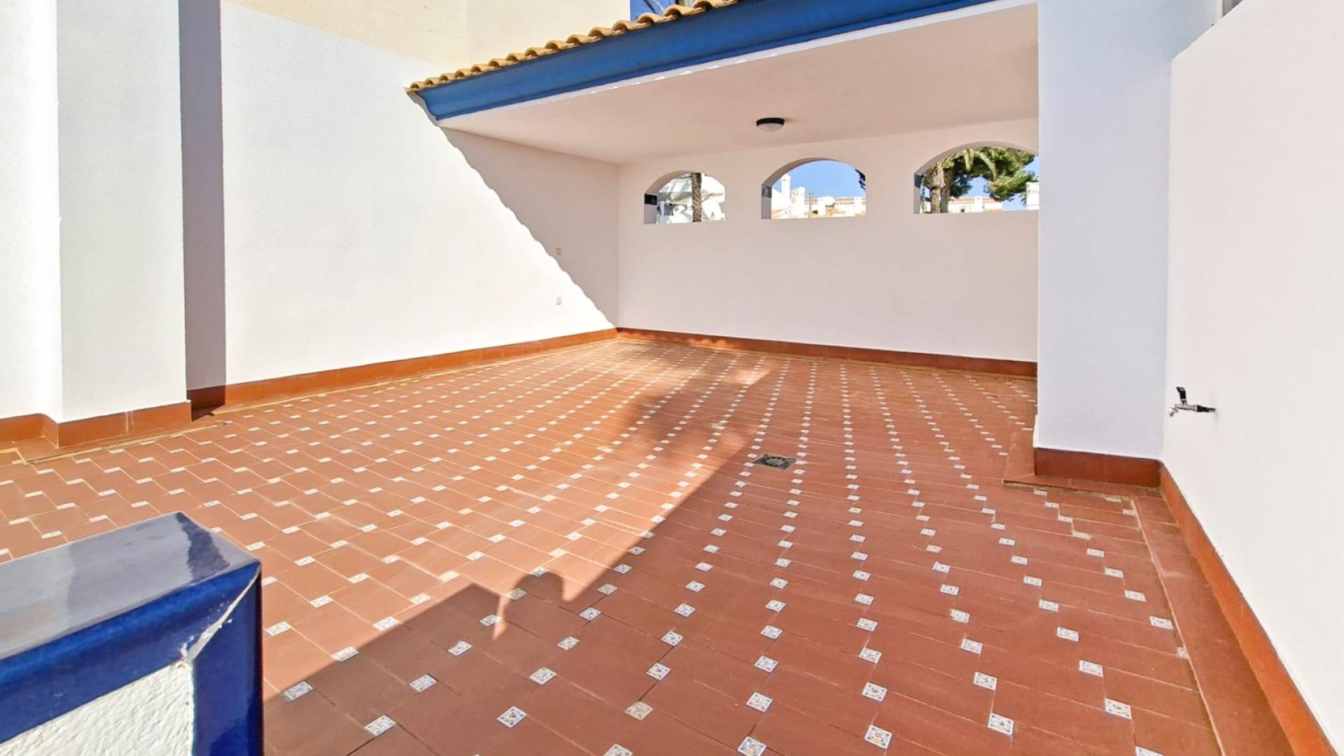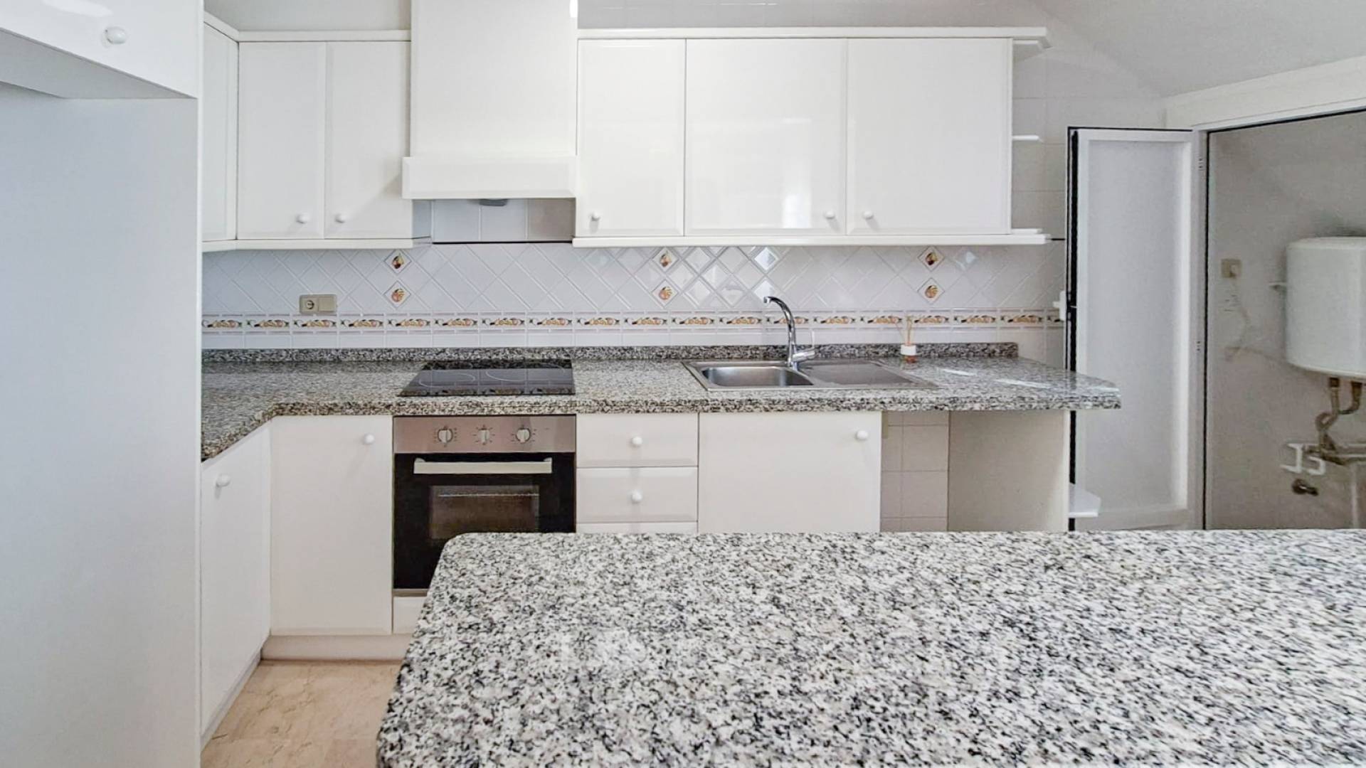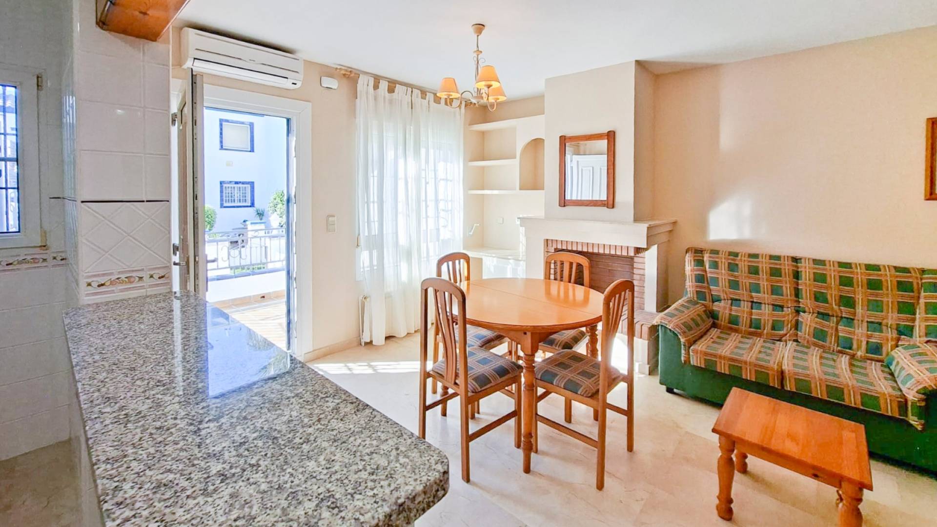The property is distributed over two floors and features a private front and rear garden, as well as a spacious solarium of approximately 36 m² on the upper level, partially covered, with lighting and a water connection, ideal for enjoying the climate all year round. On the main floor there is a bright living-dining room with fireplace, an open-plan kitchen equipped with cabinetry, granite worktop and appliances, a full bathroom, and two spacious bedrooms with built-in wardrobes. The property is sold fully furnished and ready to move into. It includes split air conditioning in the living room, ceiling fans in the bedrooms and central heating with radiators powered by a gas boiler (currently not connected). Located in a quiet residential complex with well-maintained communal gardens and two pool areas, one of them just in front of the rear garden.The location is excellent, just a 10-minute drive from the beaches of La Zenia and Cabo Roig, and surrounded by golf courses such as Villamartín Golf, Las Ramblas Golf and Real Club de Golf Campoamor. It is also close to shopping areas such as Zenia Boulevard and has good connections to the N-332 and AP-7.