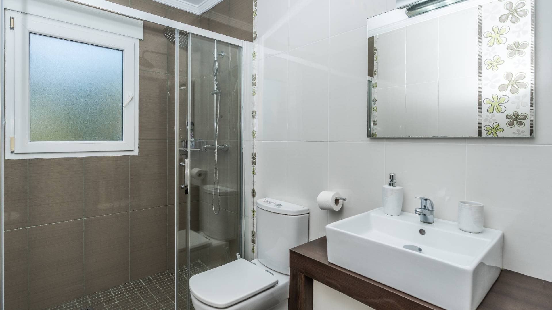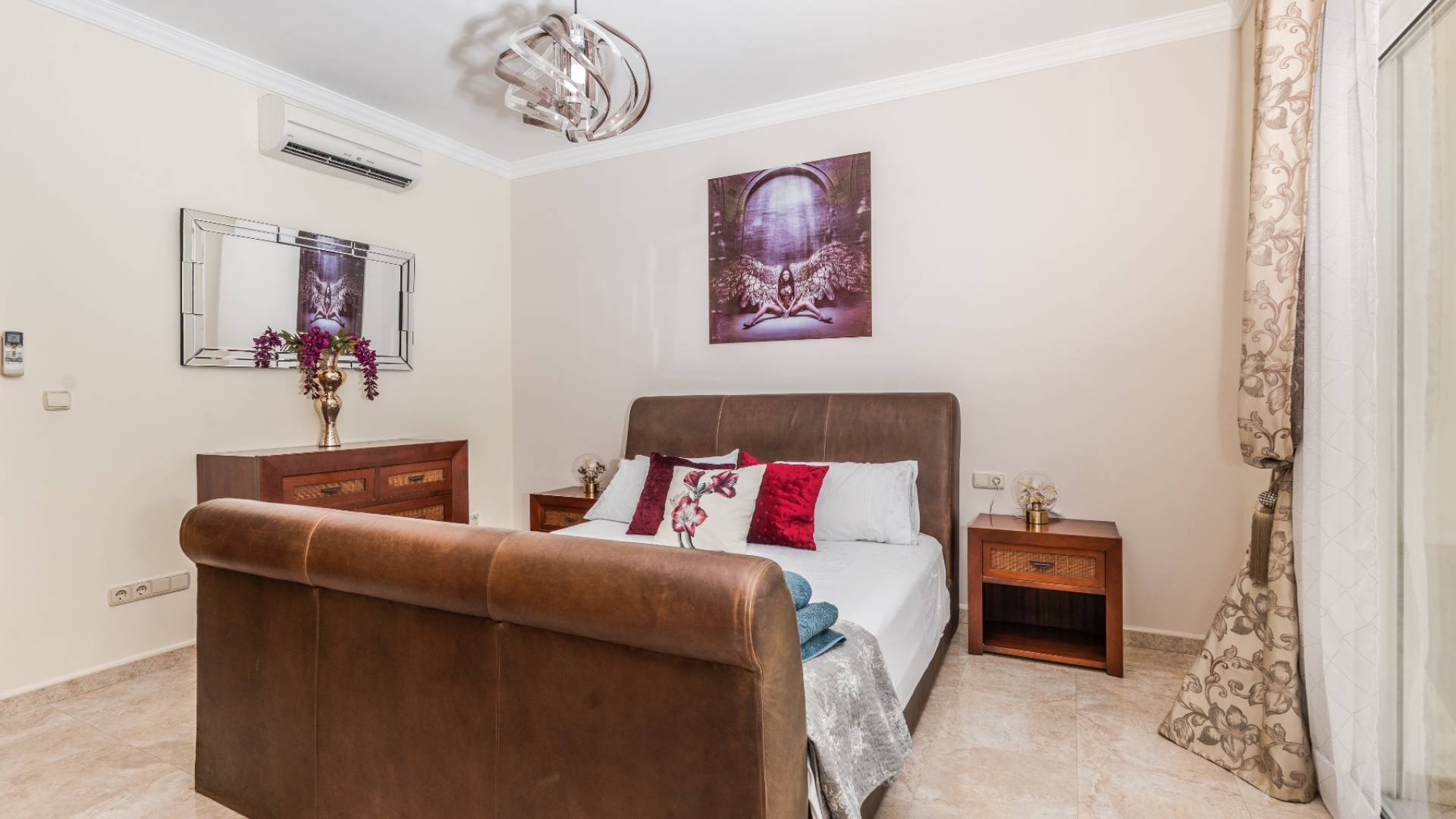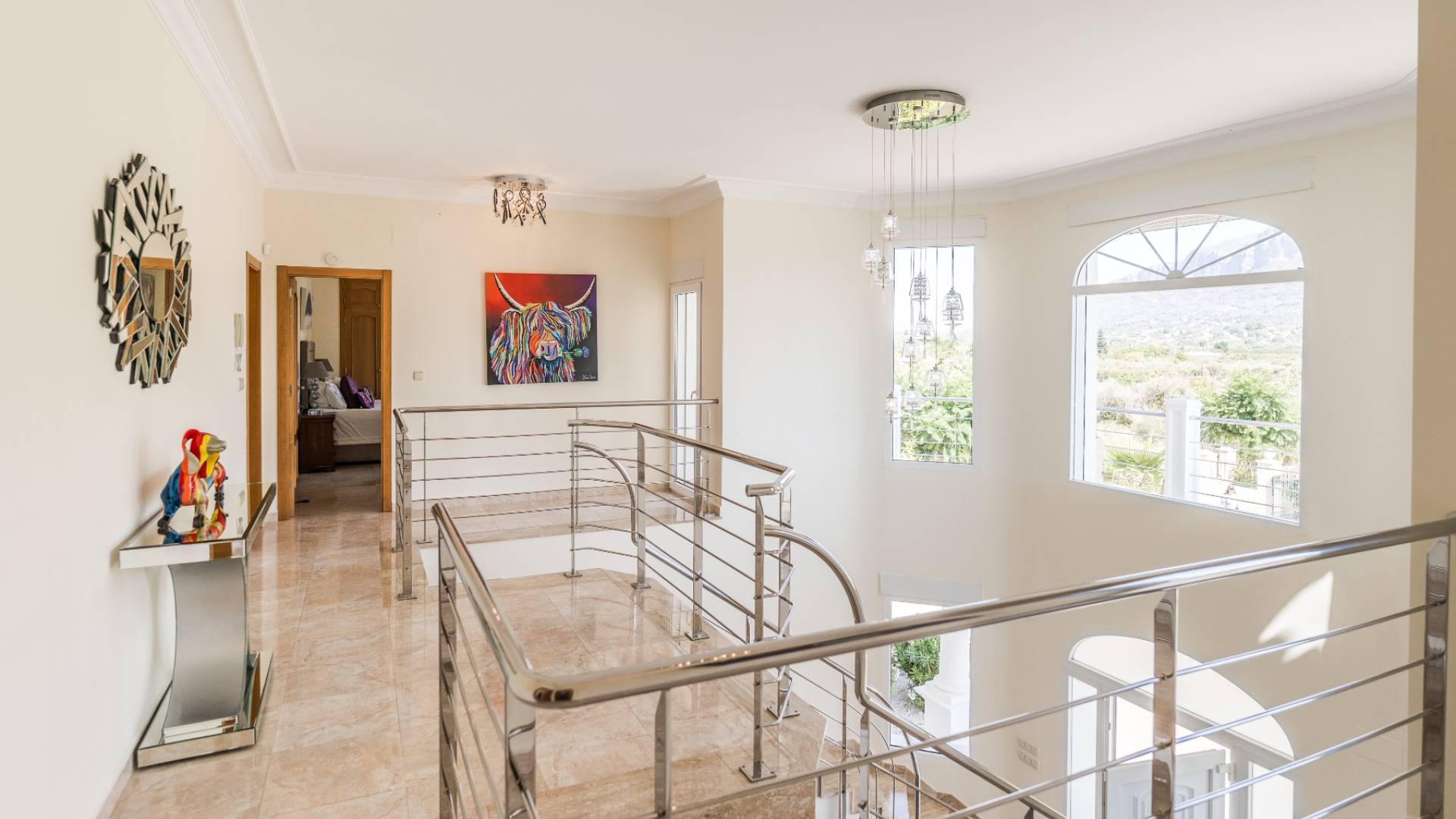 The upper floor opens onto an impressive landing with picturesque views of the Montgó mountain. There are four bedrooms on this level, all benefiting from en-suite bathrooms, with the master suite featuring a luxurious en-suite bathroom with a bathtub. A large balcony overlooking the garden and swimming pool is accessible from both the master bedroom and the adjacent double bedroom.
